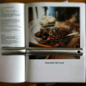 So I am sharing the discovery of the Sagaform “Hold”.  A  cookbook weight that holds your flippin’ cookbook flat.  It’s compact and easy to clean and even elegant.  It even works on the most tight-lipped cookbooks that want to snap shut the minute they’re opened.  I tested it.