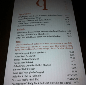 BBQ dinner at “Q“. Both of the pictures are terrible, I know. But the lighting was bad and all our hands were covered in rib sauce. I forgot to care enough. I do feel bad now with some perspective. But, forgive me and check out the menu. And drool.