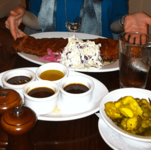 This is my plate of the Award-winning “competition, full-slab St. Louis ribs”. The ribs continue beyond the water glass and onto the floor. It was crazy. The bread and butter pickles are house-made and the four sauces are house BBQ, spicy BBQ, mustard sauce (for the Kobe brisket–we had that too–see, how could I be expected to concentrate on picture taking) and a thinner, savory sauce for the pulled pork sandwich.