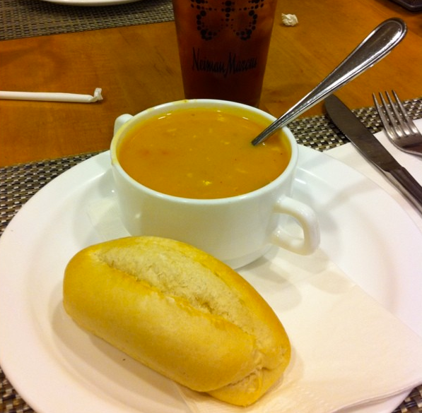 I know this kind of looks “whatever” but it was delicious! Spicy chicken tortilla soup at the Neimann Marcus cafe (Thanks Martha!). It was like a super-deluxe Campbell soup. I asked for the recipe and the waiter laughed. Which I took for a “no”. (update, look what a Google search revealed! RECIPE. Will try ASAP. Ingredients include cheddar cheese spread–see-I knew there was comfy canned soup feel)