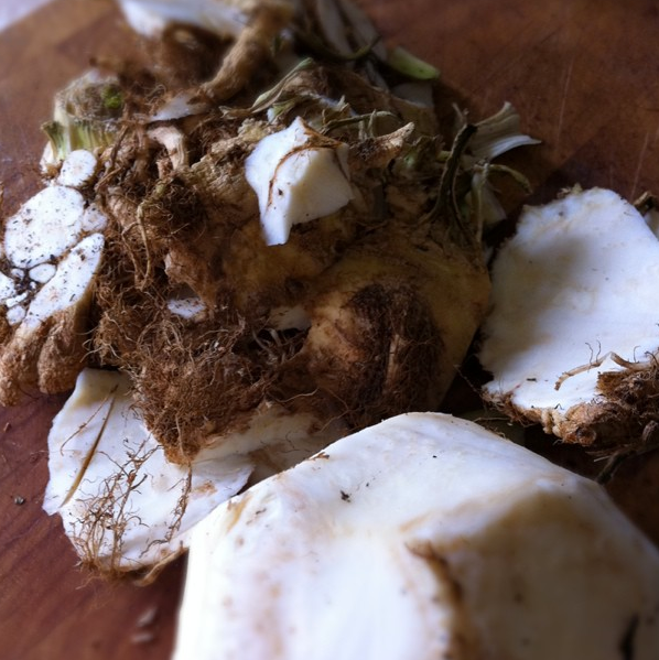 You begin with about a 1.5 pd celeriac aka celery root (I forgot to take the picture BEFORE peeling, sorry). And slice into 3/4 inch pieces.