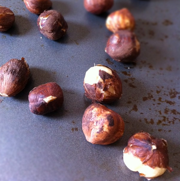 Just to make sure the oven is not feeling left out, preheat to 275 F and toast 1/3 cup hazelnuts. Skin on. Cool and roughly chop. Set aside.