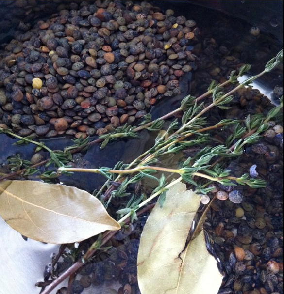Meanwhile you gather your lentils, some thyme and a couple bay leaves, add 3 cups water and bring to a boil.