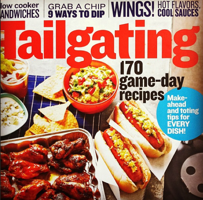 I found this TAILGATE magazine at Wal-Mart (issued by Better Homes and Gardens). Right away I thought, if “Grab a chip! Nine ways to Dip!” doesn’t fit into my new vegetarian-ish lifestyle, then I don’t know what does. (Count ’em! 1. Spinach-dill 2. Roasted pepper hummus 3. Corn and black bean chutney guacamole 4. tomatillo salsa 5. Spinach-Articoke-Blue cheese and bacon (all vegetarians still eat bacon) 6. Mexican seven layer 7. Chocolate Fruit Dip and 8. something called Amaretto fluff…..hopefully there’s not a kitten involved)
