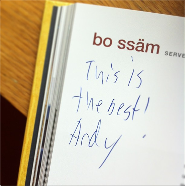 Especially now that I finally made the Bo Ssam that every blogger every has already posted about, the book is on my “featured” bookshelf (also because it is great reading). The Bo Ssam recipe came to me at the perfect time as we were having a BBQ (planned for a weekend of torrential downpour–so trying to feature meat but not on the grill) and aside from having delicious, easy food, I wanted to do something fun. I haven’t had a “cooking day” in a while, and hurriedly making dinner for the family does not count ever. (Almost ever.) So meat that would be in the oven for hours, making the house smell inviting with it’s with potentially fantastic results seemed like a great idea… Andy said it would be the best.