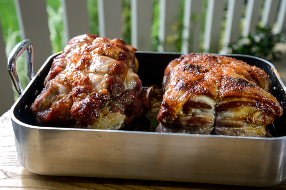 At that point, when you’re drooling and ready to eat you rub the exterior with a bit of salt and a lot of brown sugar, and fire the oven up to 500° F. Then in goes the meat for about 10 minutes until the exterior is sweet and crusty (David Chang calls it a “pig shoulder encrusted in Pig Candy” in the book).