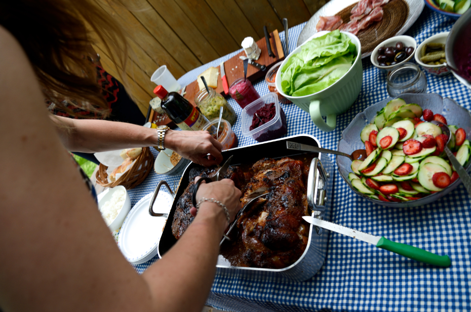Finally you bring it outside (under the tarp your husband spent 3 hours putting up for a storm that would pass before the guests arrived) and you hesitate…..where to start? All the guests, expected to eat at least 1 pd of eat each, hovered. We also had an emergency as the steamed rice I had picked up from the Chinese food place was actually discovered to be fried rice. Which was not going to work with my lettuce wrap plan. (luckily the problem, a bike ride away was resolved though I admit I may have panicked and slightly overreacted when I saw the fried rice–possibly freaked out just a little?)