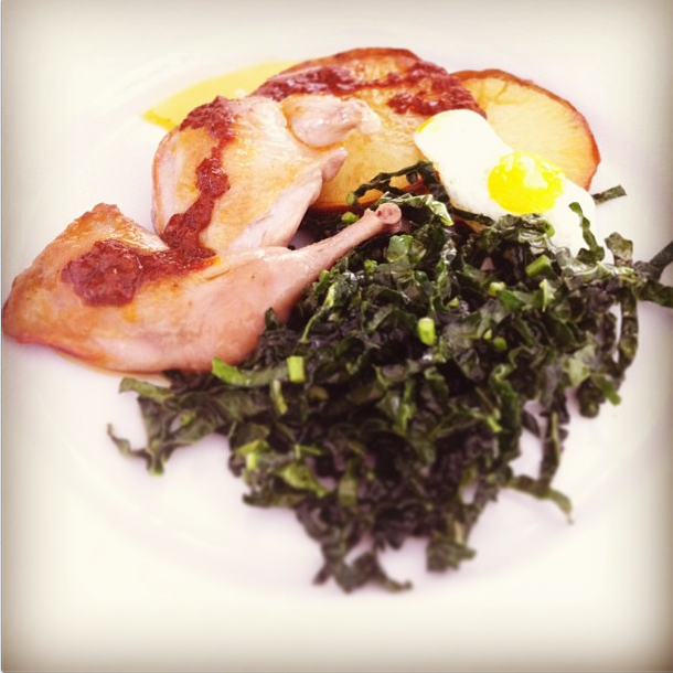 I started with a glass of white wine (my actual request was local and not excessively oaky) and ended up with a lovely glass of minerally Zuni Chardonnay which hails from a vinyard in Santa Cruz. Felix has the best apple juice he’s ever sipped-organic, fresh pressed. Tad had an Anchor Steam beer. His main was the Wolfe Ranch quail with quail egg, pan-fried sweet potatoes, kale salad and harissa.