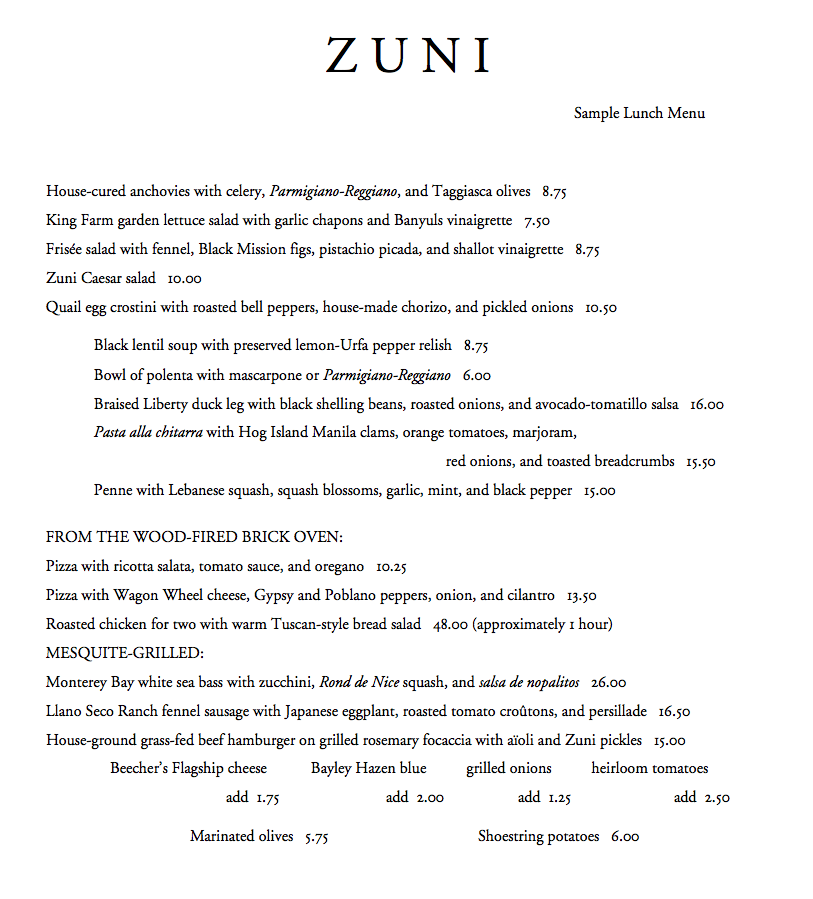 We drove to the Zuni Cafe straight from the airport with loads of time to get there. Or so we thought since we allowed not too much thought for finding parking (you’d think coming from Toronto…) but I suppose we were in vacation mode.