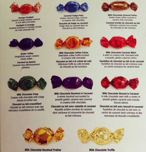 It’s actually a chocolate and toffee “collection” (I’m giving up stamps immediatly -what was I thinking?) and the first thing I noticed is that all the 11  flavours on the chocolate map (see below for some blurry details) were tempting.  Not a chocolate brandy cherry in site.  I think I would eat the orange fondant last but my dad would head straight for it.