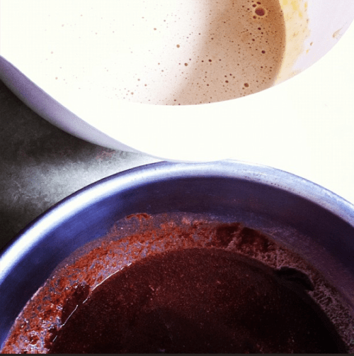 4. Pour the chocolate mixture into the egg batter and whisk the two until combined.