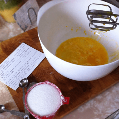3. Now you’re going to put your eggs in a large bowl and whisk them lightly with a hand blender and then add in 1 cup white sugar, 1 cup brown sugar, 1/4 tsp salt and 2 tsp vanilla.