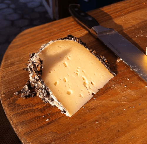 The couple that sell their cheese at this stall have roots in Italy. Jody was a shepard and their traditional Italian cheeses are made mainly from sheep milk. This one is covered in wine must sourced locally in New York. The flavour of the grapes worked its way into the paste.