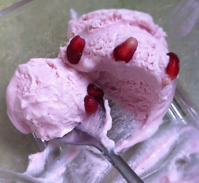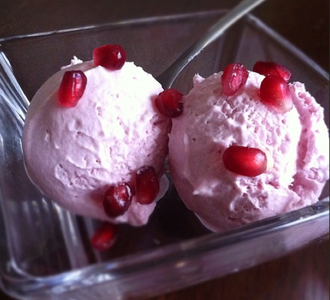 But then I was inspired to take the healthy pomegranate and fatten it up into a simple and delicious, no-churn ice cream. (Using a recipe from Nigella Lawson‘s cookbook Nigella Express.) Who other than Nigella could completely kill the heart-healthy attributes of a pomegranate with 2 cups of whole cream? Screw sprinkling the arils on a salad, I latched onto her bandwagon fast.