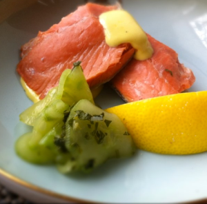I served the salmon flaked and made lemon mayonnaise to go with it and an amazingly fresh, lime/mint/cilantro cucumber salad (Skye Gyngell’s recipe again). Plus baguette.